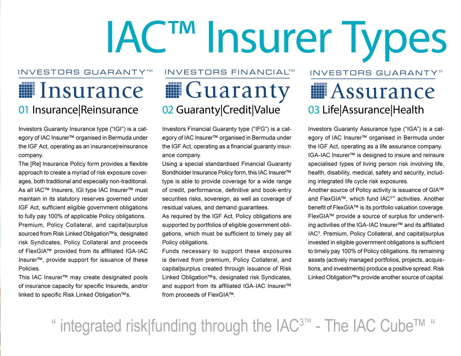 The concept of IGF's three insurance subsidiaries, original protoype for IAC Cube™ concept, is comparable to licensing use of core operational technologies within IAC Cube™ framework, a successful concept developed, prototyped, operated, then repeated many times. By way of additional comparison, each IAC™ Insurer might be compared to a Lloyd's Syndicate.